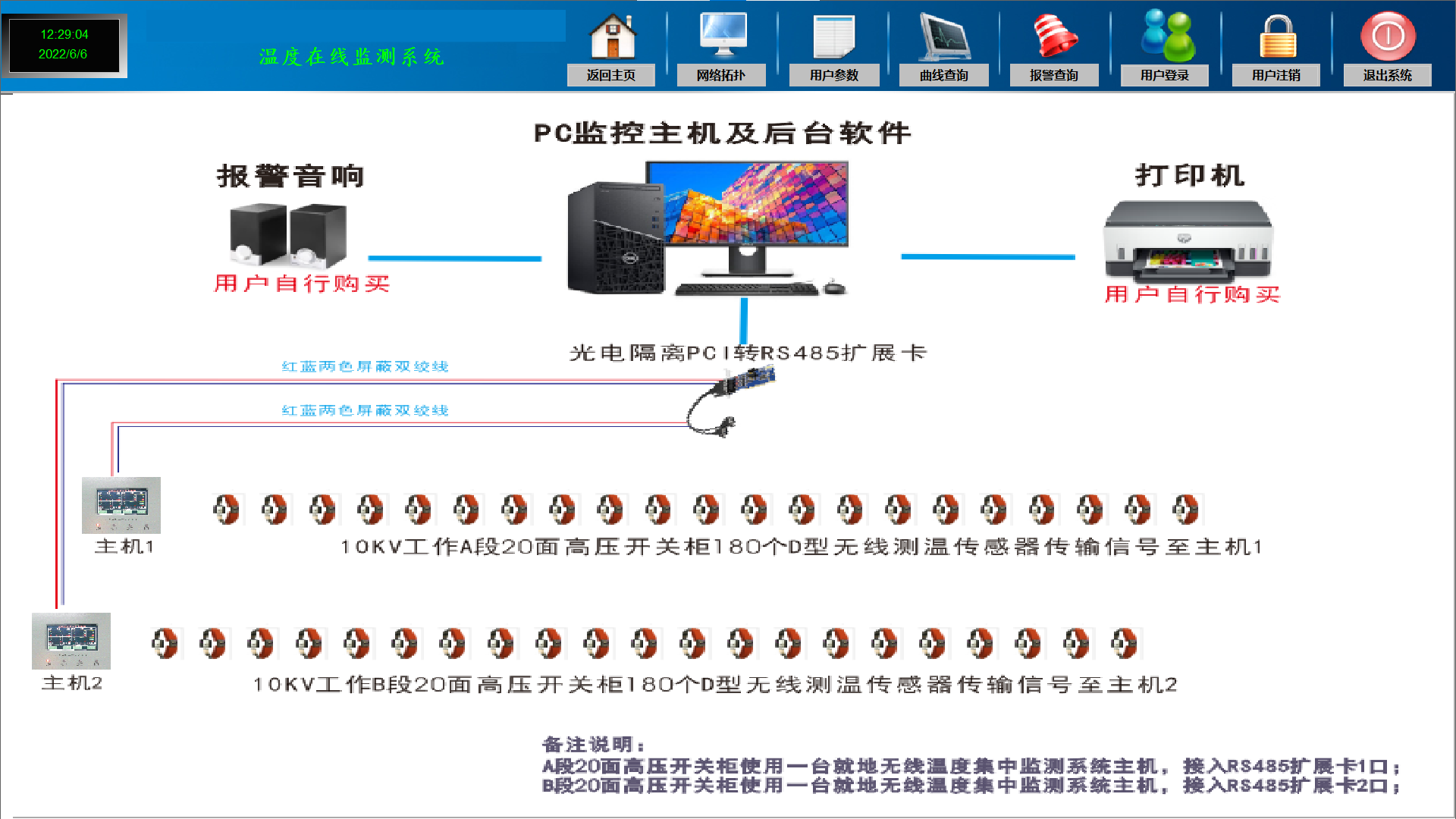 测温监控系统對(duì)各個(gè)被测温设备的操作主要包括主页温度界面、网络拓扑、用户参数、曲线查询、报警查询、用户登录、用户注销、退出系统。主要功能如下: